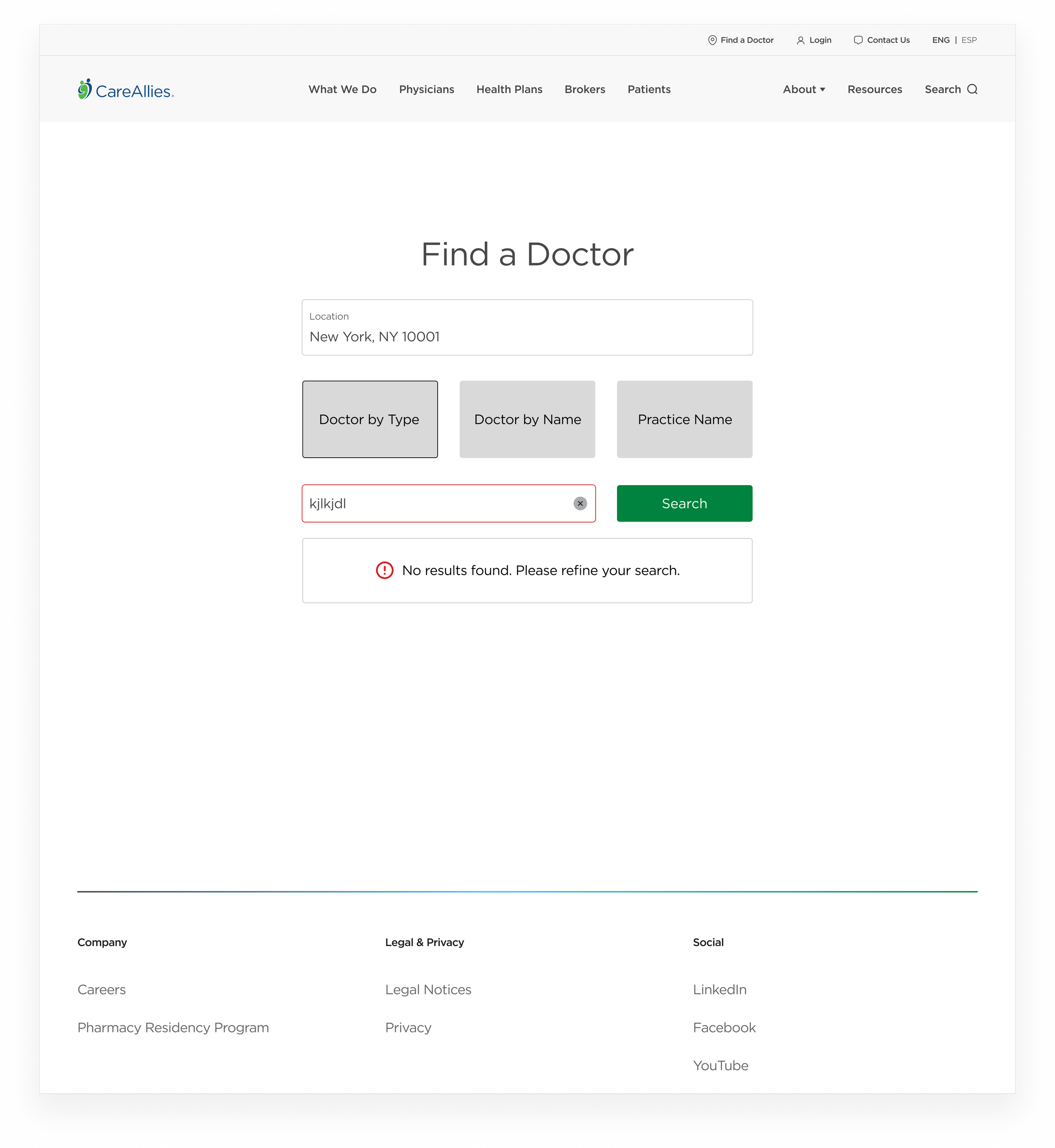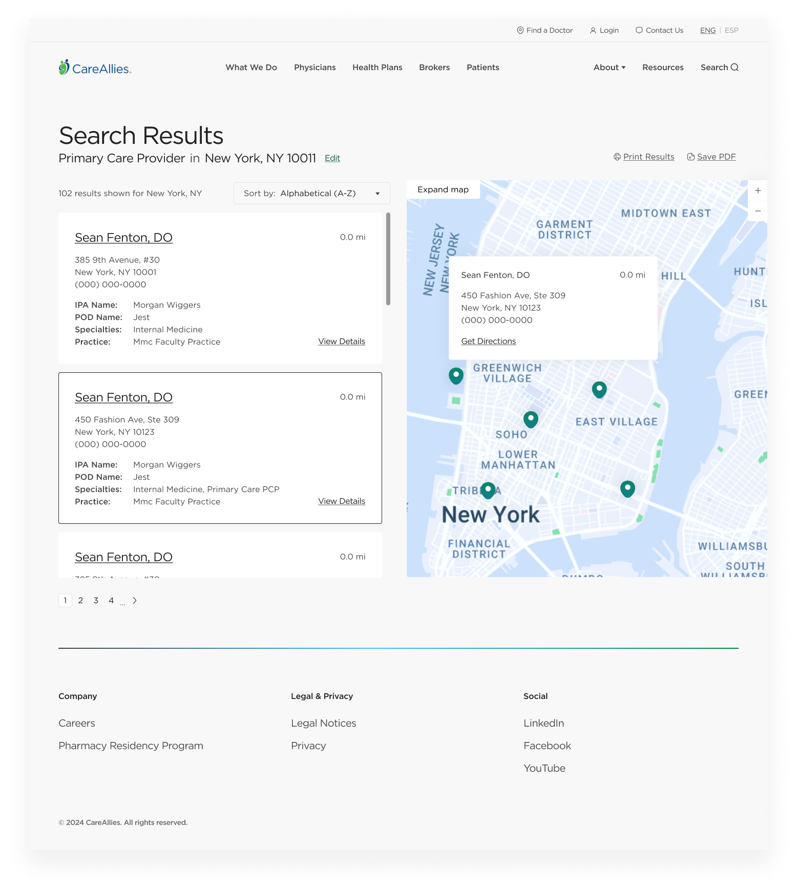 Designing a “Find A Doctor” experience for CareAllies presented several unique challenges. One major hurdle was ensuring that the process of searching for and selecting a doctor was intuitive and user-friendly, while also integrating an interactive map for geographical context. This required a careful balance of simplicity and functionality. Additionally, maintaining consistency with the existing brand guidelines and developing a component library added another layer of complexity. Collaborating with stakeholders and iterating on designs were essential to overcoming these challenges and delivering a cohesive, effective product.