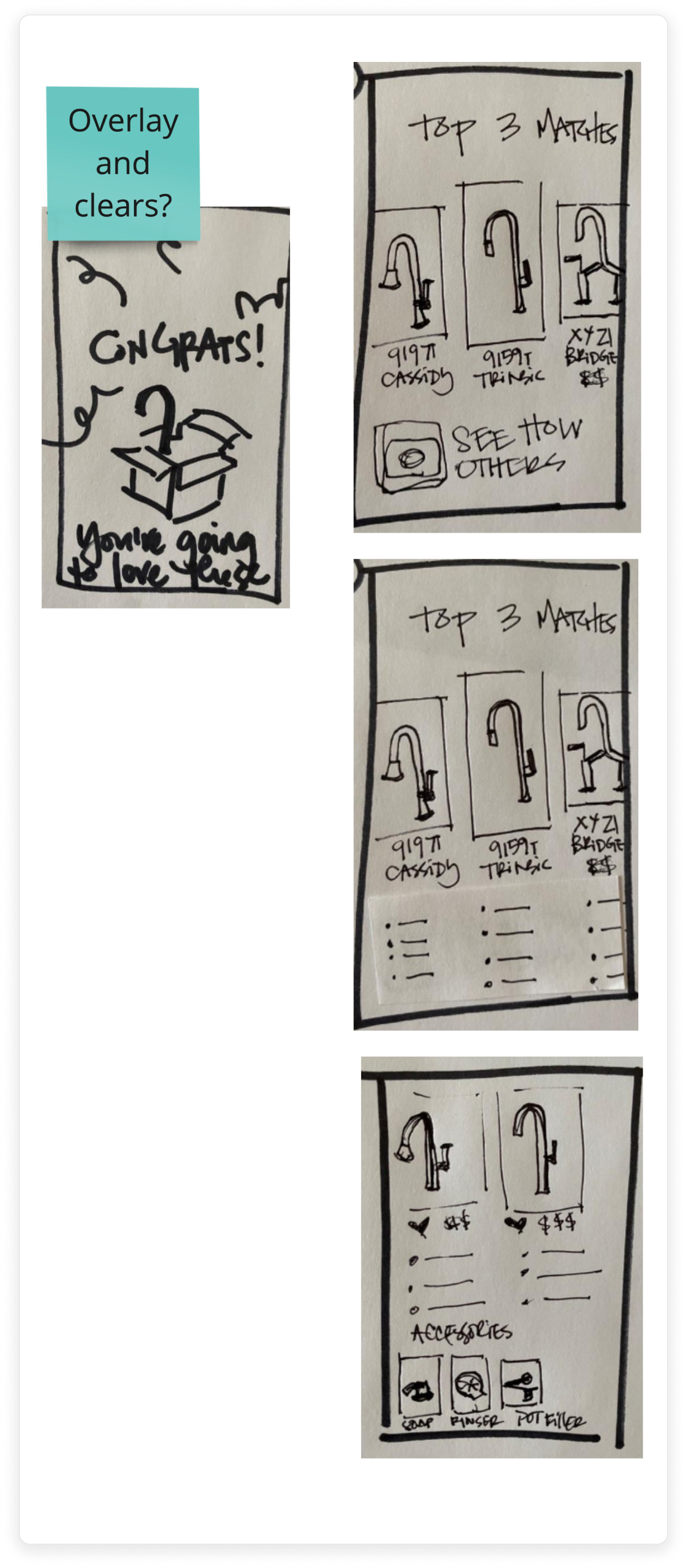 The biggest challenges for this project were reconciling the split in the flow for users who were starting from scratch and users who were just replacing their faucet. To remedy this I had to determine what questions would then follow. For users that were starting from scratch the sky was the limit - they were starting off with a blank slate and could be asked anything. However, for users that were replacing their existing kitchen sink it had to be determined the number of holes they currently had. Depending on the number of holes accessories had to be accounted for and how many users were allotted.
