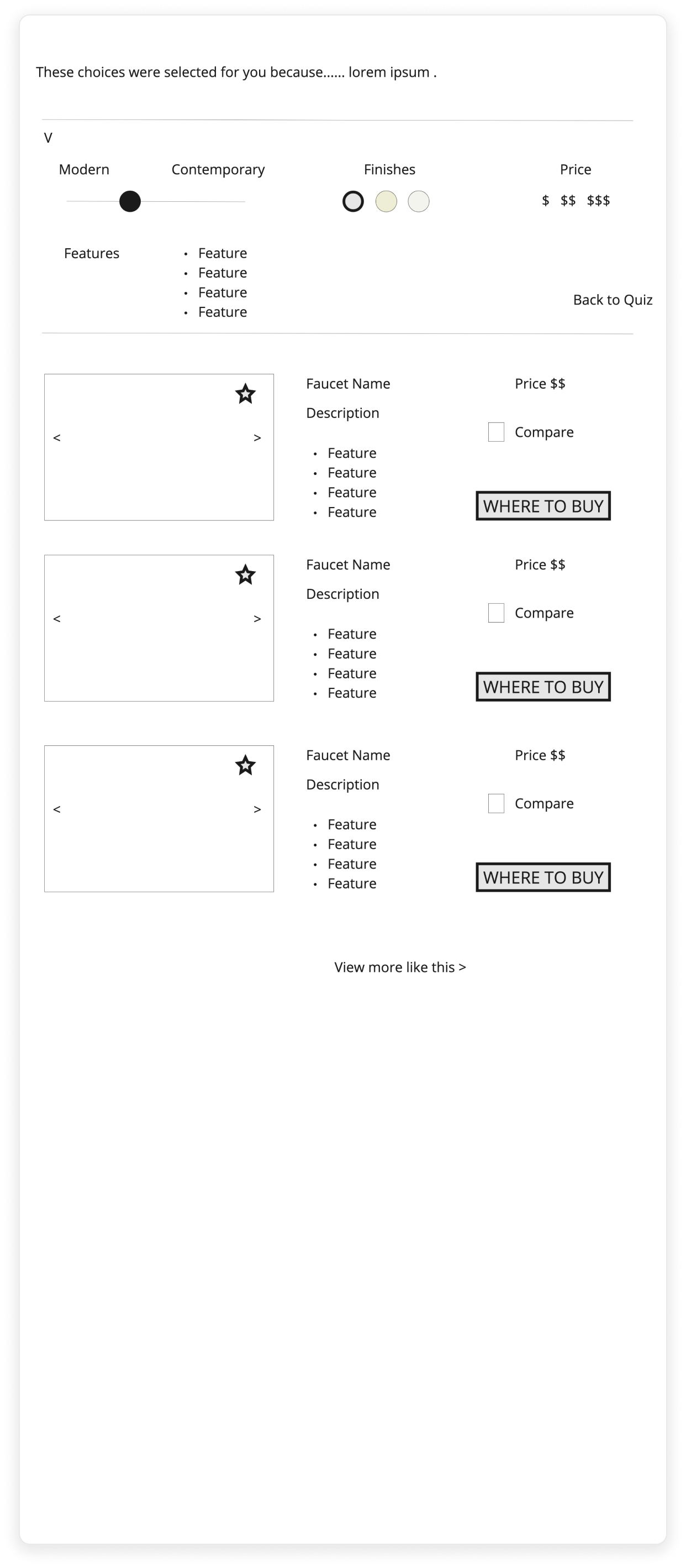 In the process of creating wires I wanted to really leverage the results page to be more dynamic. This meant giving the user the option to change their results within the page rather than having to jump back into the guided selling quiz. The format to effect changes was also meant to be kept conversational and light as if they were talking to a sales associate in-store.