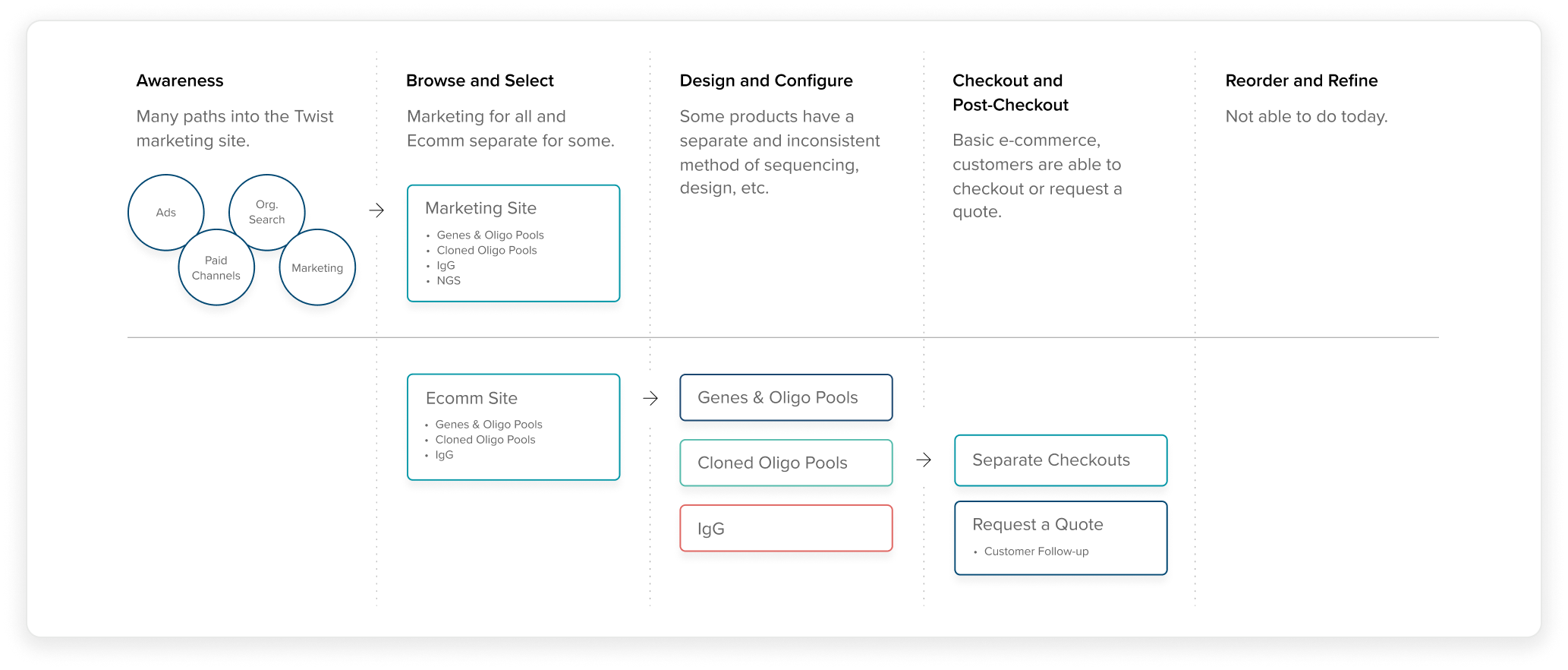 Twist Bioscience is a biotechnology company focused on synthesizing DNA. They offer a wide range of products and services that enable their customers to accelerate their research and development efforts by allowing their users to create their own custom DNA sequence. Their current website experience was split between their marketing and e-commerce, creating friction in the overall purchasing journey.